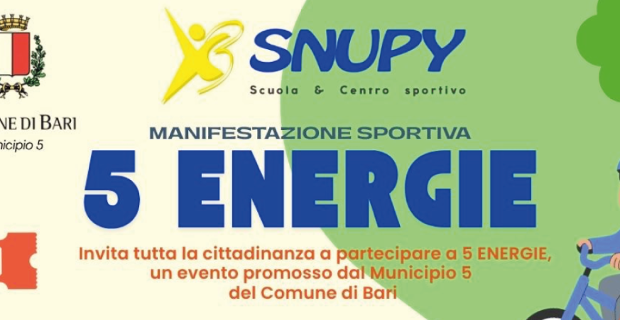Il Municipio V di Bari rinnova il suo impegno per la promozione dello sport con una nuova edizione di “5 Energie”, iniziativa gratuita che abbraccia diverse discipline e punta a coinvolgere cittadini di tutte le età. L’appuntamento, sviluppato in collaborazione con associazioni sportive del territorio, trova in Palese la sua cornice ideale, trasformando per alcuni […]
